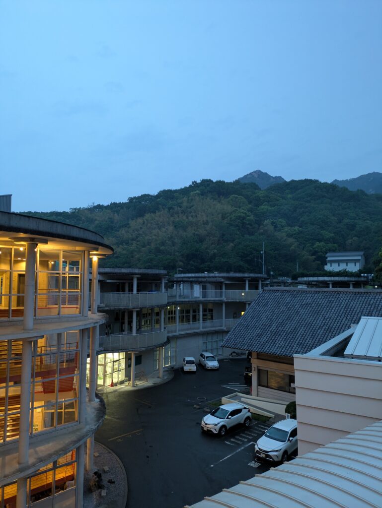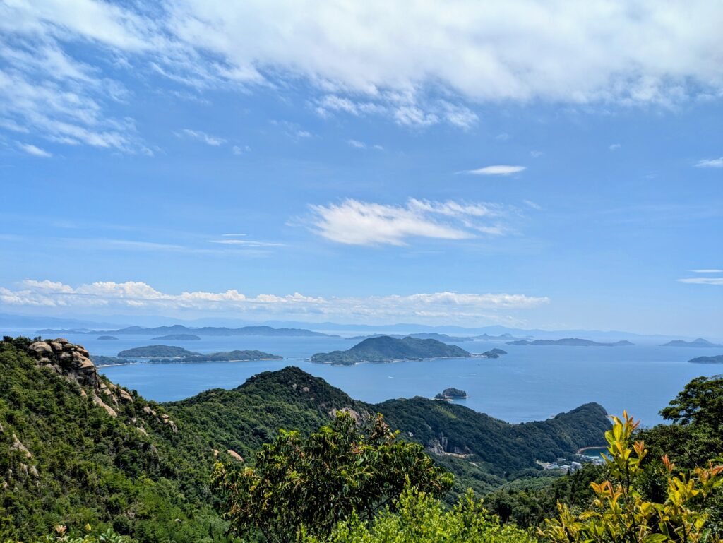 宿の背後にそびえる「火山」。麓からのハイキングはもちろん、車で頂上付近まで上がることも可能です。山頂からは、遠く四国地方まで瀬戸内の島々が360度見渡せる圧倒的な絶景が広がります。