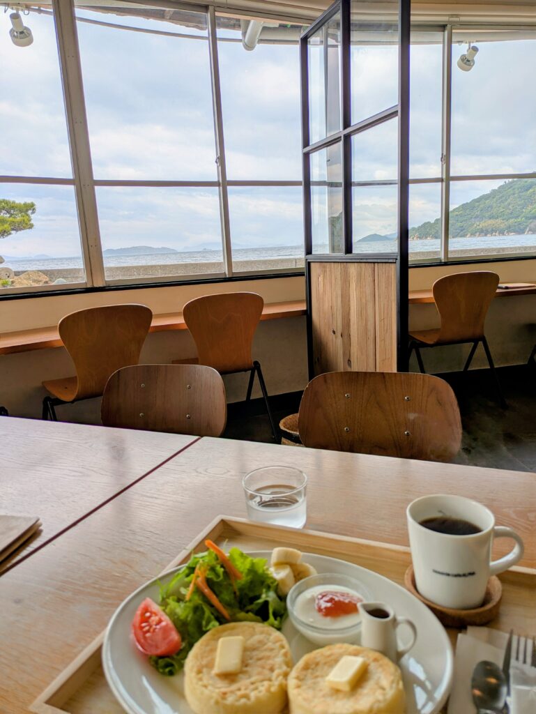 焚き火のようにゆらぐ炭の炎、潮風の香り。五感がゆるむ美味しい時間がここにあります。右の画像は カフェアルファの朝食セット。
