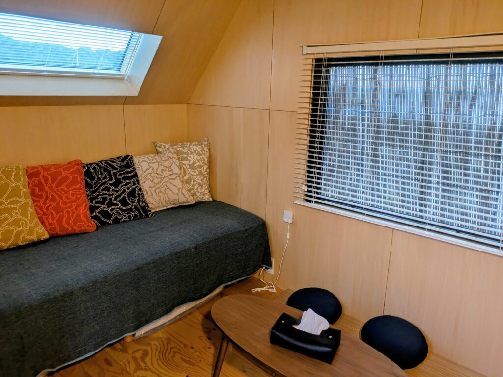 2つのソファーベッドがあり、寝室と合わせて4人まで宿泊が可能です。こちらは、ご自身でのベッドメイクになります。2人での宿泊の場合は、リラックスルームとしてお使いください。坐禅をするのもいいでしょう。小さい簡易の畳と坐禅用の座布団も置いてます。